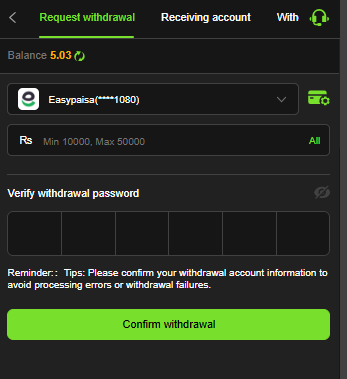 - Select your withdrawal method (JazzCash, Easypaisa, or bank).